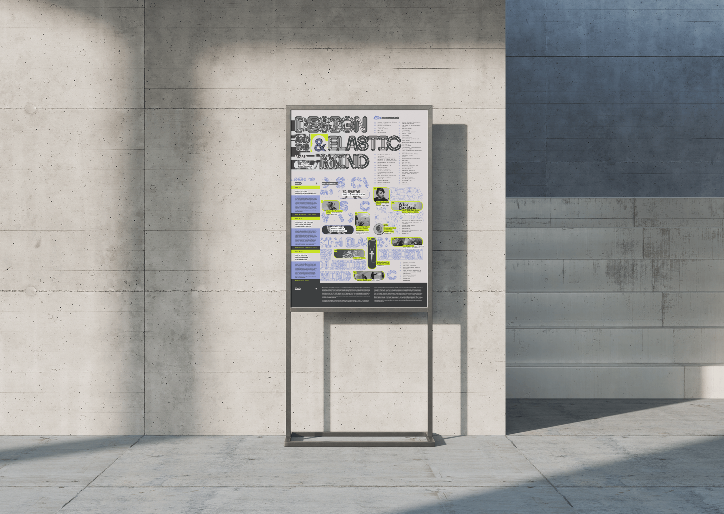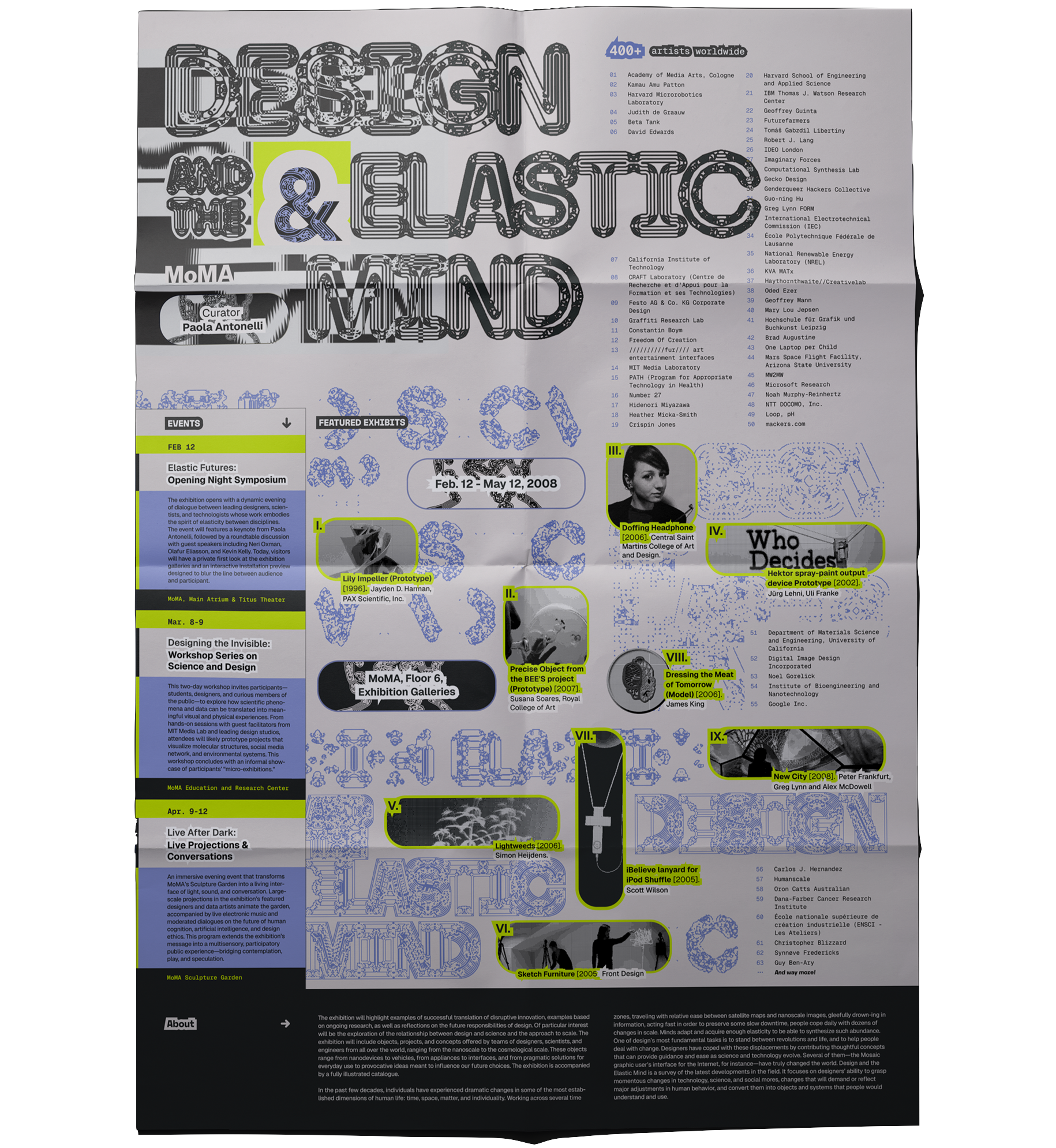 BackThis poster is part of a set of speculative branding materials created for MoMA’s Design and the Elastic Mind (2008), an exhibition exploring disruptive innovations at the intersection of design, science, and engineering. The exhibition frames design innovation as a form of engineering progress, where our understanding of the physical world is renewed by an ability to exert control from the nanoscale to the macro-scale. Letterforms are generated through cellular automata, revealing the text from disintegrating and reintegrating particles and new aesthetic possibilities born from the logic of generative systems.