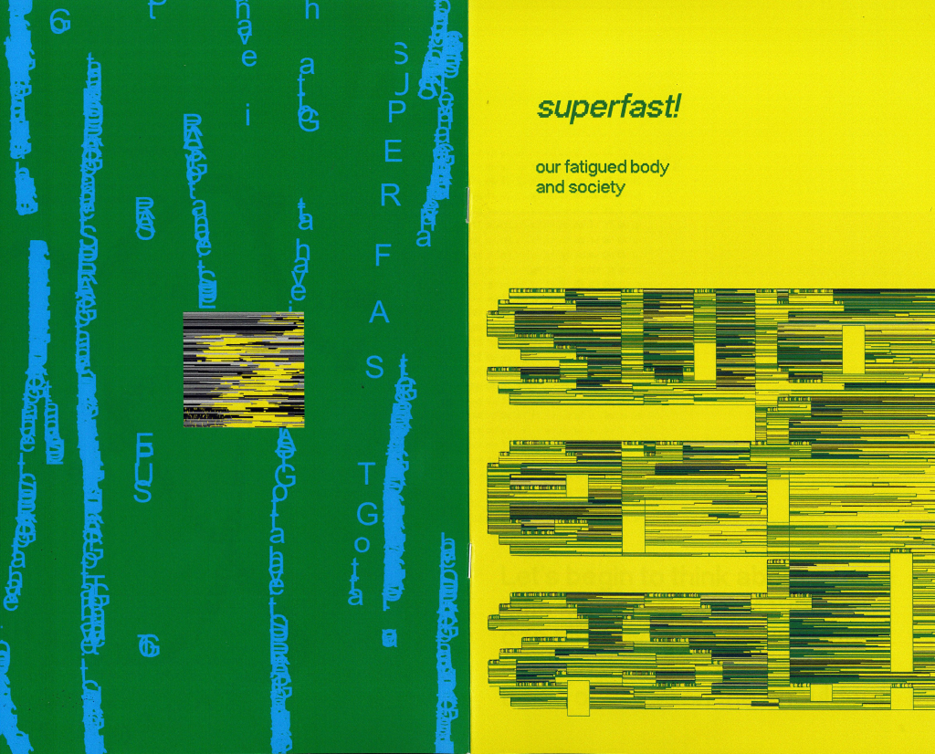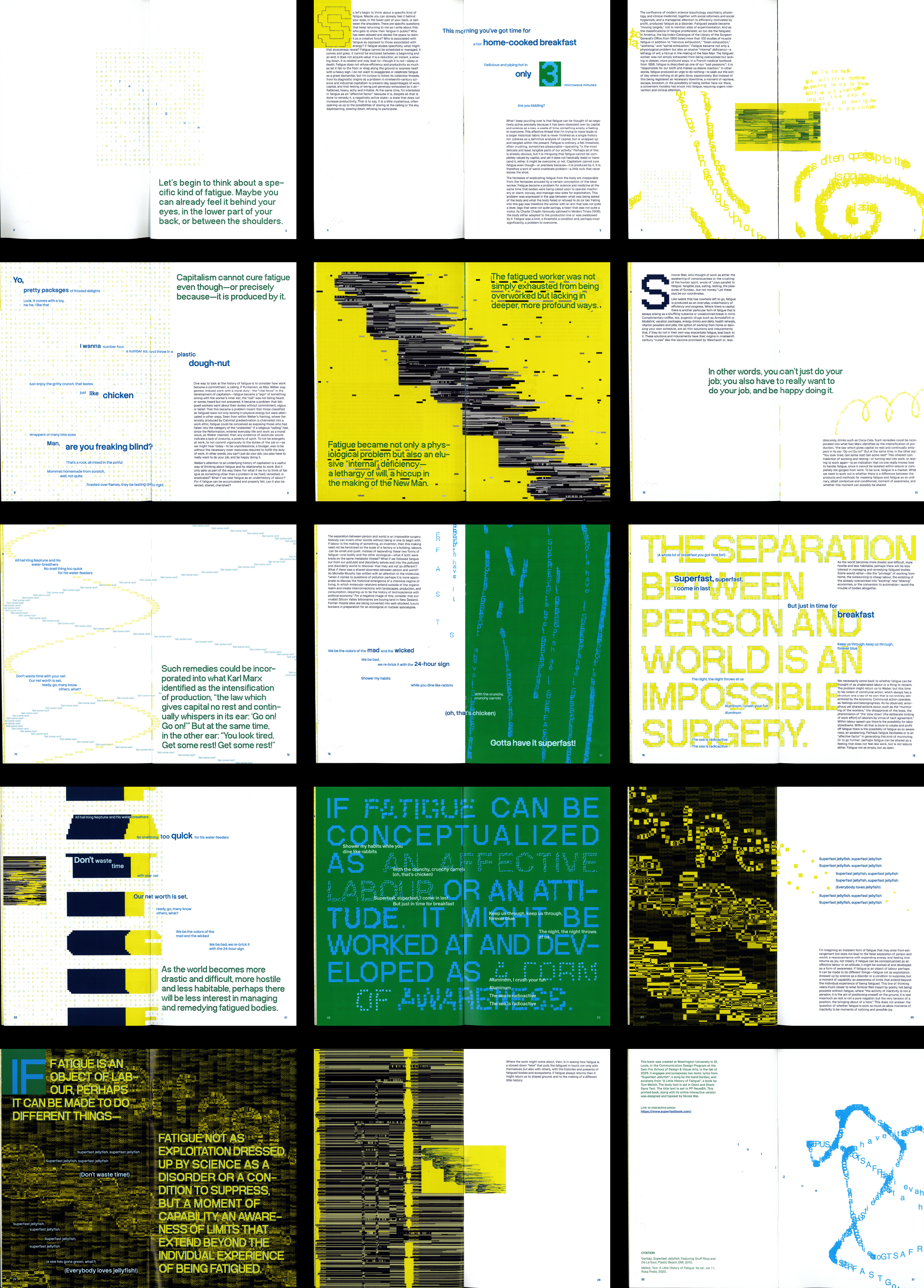 Superfast! Our Fatigued Body and Society is a book that examines speed, overdrive, and exhaustion within contemporary work and consumer culture through the synthesis of two found texts: “Superfast Jellyfish,” a song by the virtual band Gorillaz, and A Little History of Fatigue by sociologist Tom Melick. Placed in dialogue, these texts expose a dialectical tension between acceleration and burnout, stimulation and depletion.