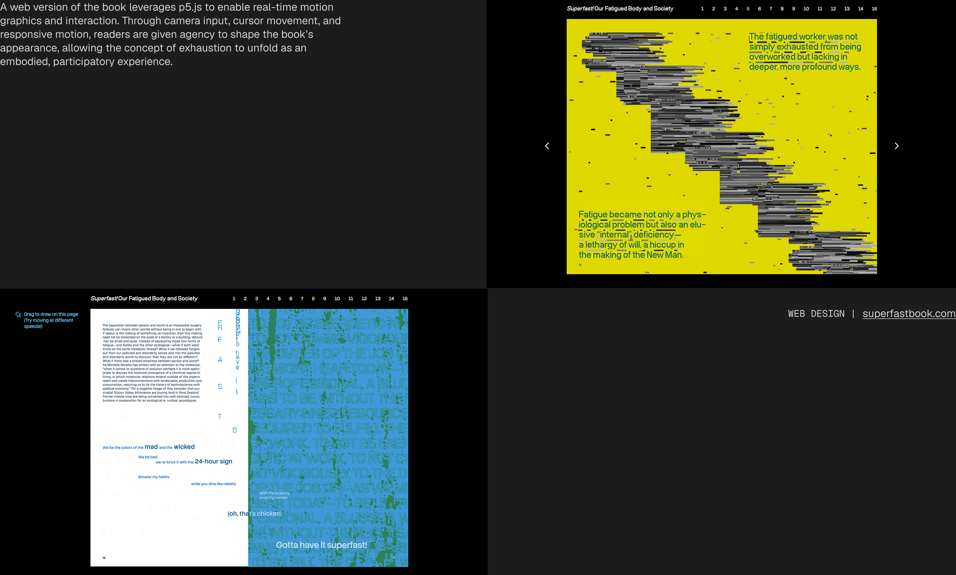 BackSuperfast! Our Fatigued Body and Society is a book that examines speed, overdrive, and exhaustion within contemporary work and consumer culture through the synthesis of two found texts: “Superfast Jellyfish,” a song by the virtual band Gorillaz, and A Little History of Fatigue by sociologist Tom Melick. Placed in dialogue, these texts expose a dialectical tension between acceleration and burnout, stimulation and depletion.